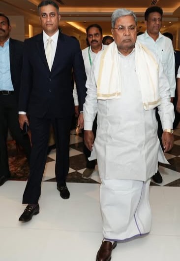 If the occasion is a little formal, he wears a waistcoat, mostly in blue colour. When Ponnanna accompanied deputy chief minister D.K. Shivakumar, to meet Tamil Nadu chief minister M.K. Stalin, Ponnanna was in a suit.